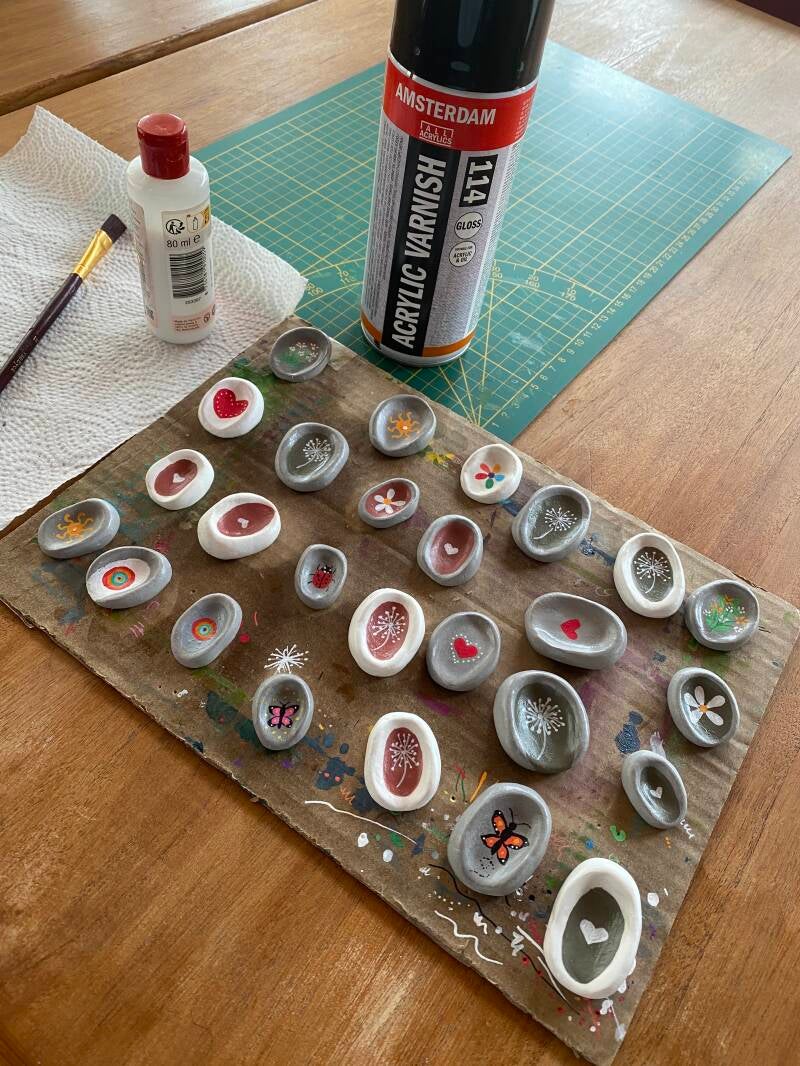 Nadat de verf goed was gedroogd, bewerkte ik de steentjes met verschillende lagen vernis.
