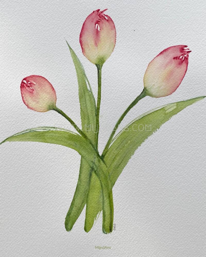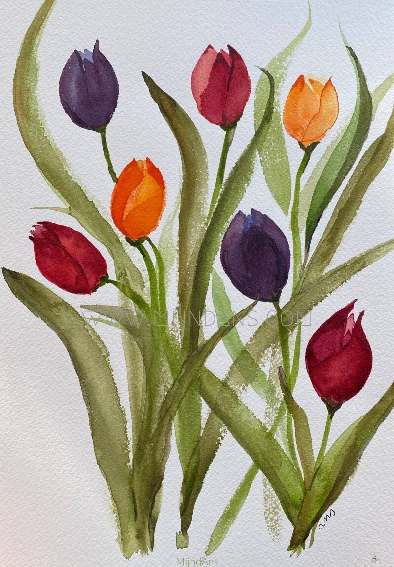 Toen ik net begon met aquarel, schilderde ik al snel een bosje tulpen.