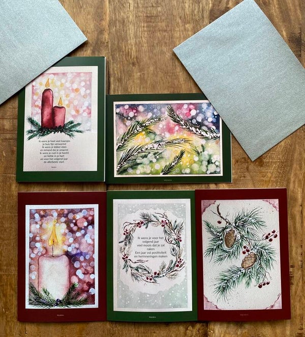 5 verschillende gevouwen wenskaarten voor de feestdagen met zilverkleurige structuur-envelop.