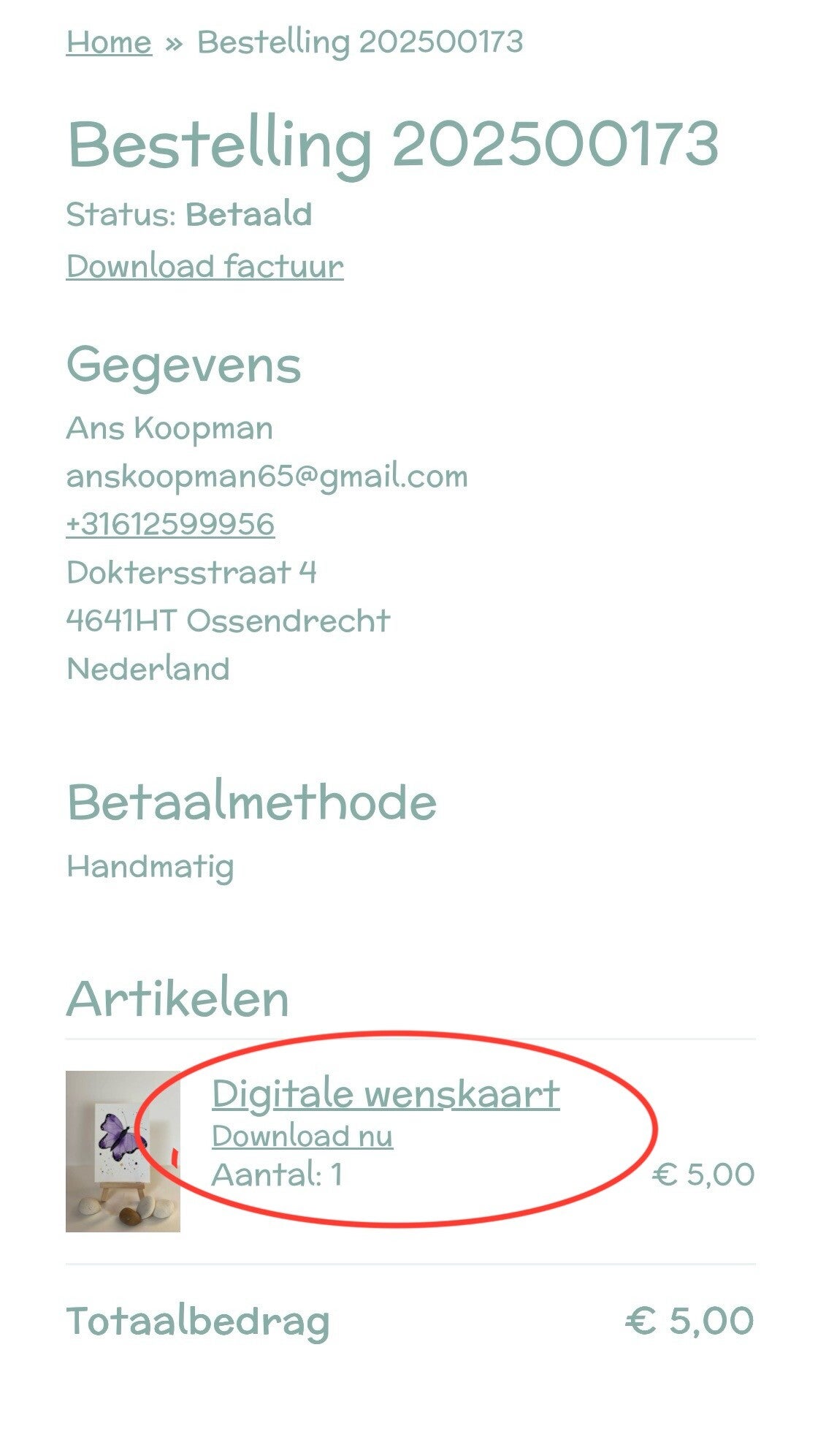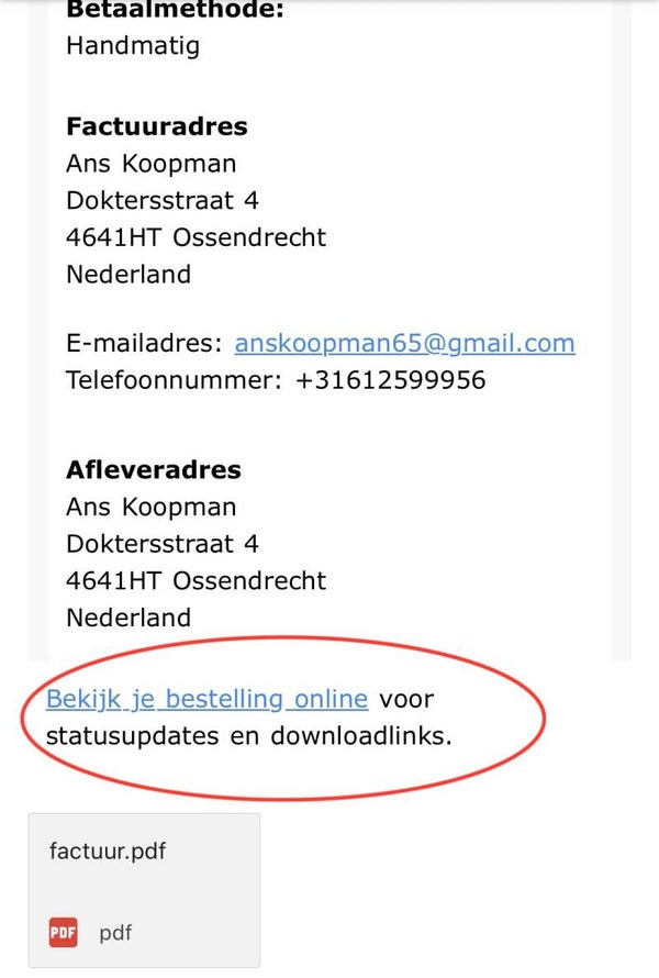 Ik stuur je een betaalverzoek en zodra dat is betaald, kun je via je bestelbevestiging in je bestelling kijken (zie voorbeeldfoto's) en daar je product (zonder watermerk) downloaden.