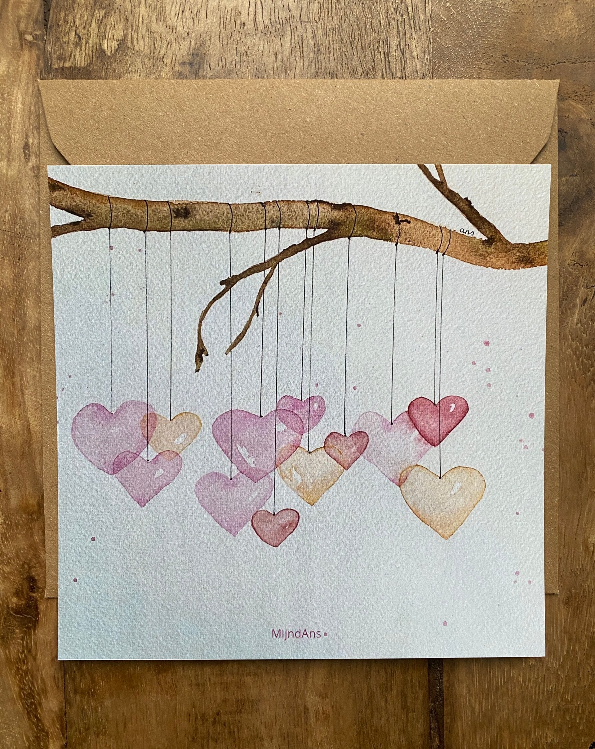 De vierkante kaarten met hartjeshangers en knuffelhart.