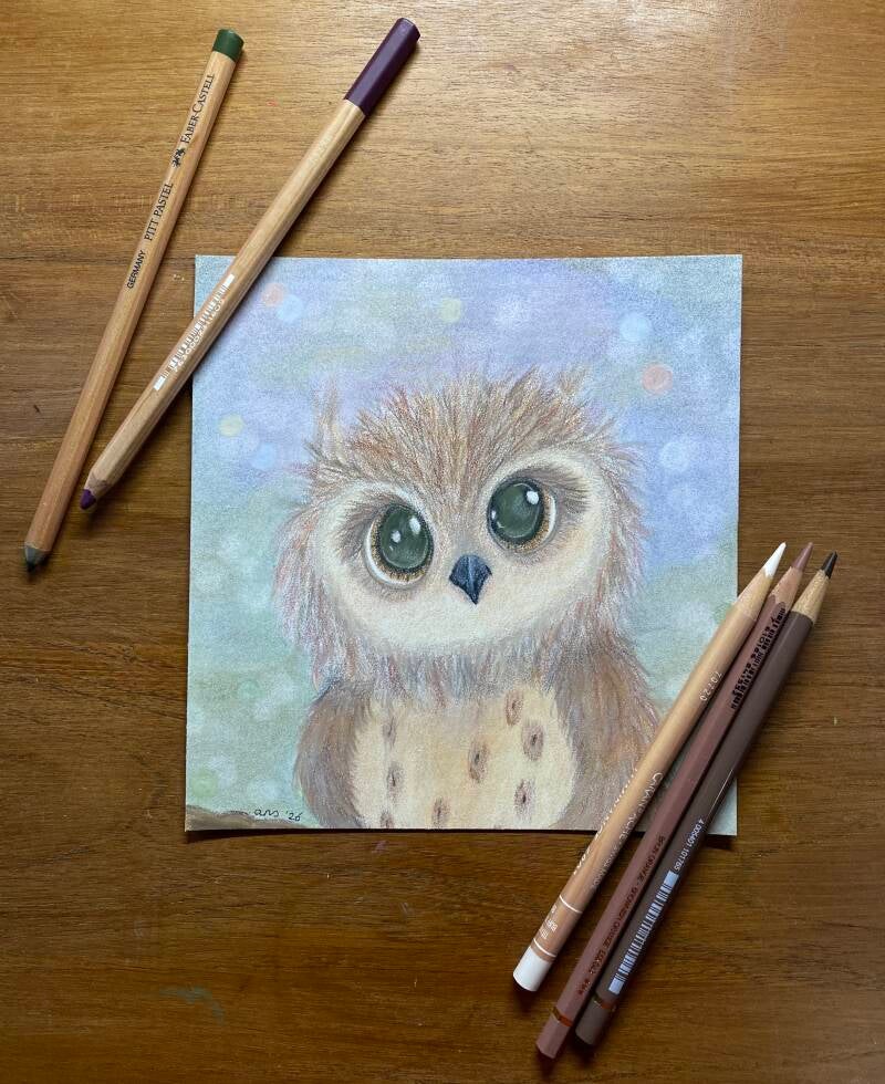 dit uiltje is getekend met kleurpotloden en pastelpotloden.